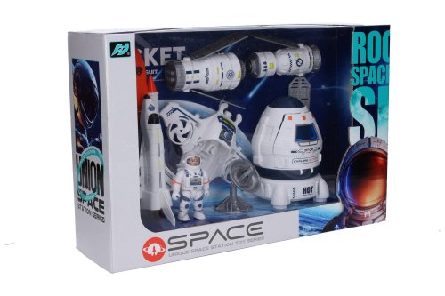 Vesmírny set s figúrkou. Veľkosť figúrky 8 cm. Obsah - figúrka kozmonauta, raketa s raketoplánom, modul, satelit, dron, 2 družice.