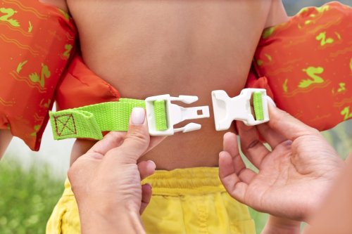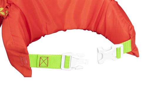 Vesta je opatrená zadnou prackou s nastaviteľným zeleným popruhom, ktorý umožňuje ľahké a bezpečné upevnenie na tele dieťaťa. Pracka je navrhnutá tak, aby si ju dieťa samo nedokázalo rozopnúť, čo prispieva k jeho bezpečnosti počas vodných radovánok. Vďaka tejto konštrukcii vesta pevne sedí a zaisťuje tak maximálny komfort aj ochranu počas pohybu vo vode.