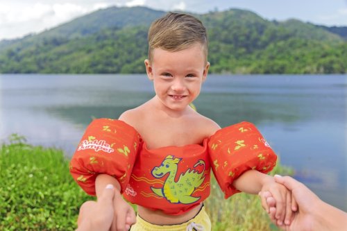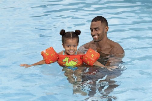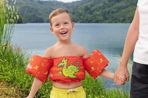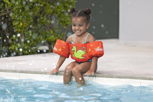 Vesta Monster s rukávmi je detská plavecká vesta navrhnutá pre deti vo veku od 2 do 6 rokov, ktorá ponúka bezpečnosť a pohodlie pri pobyte vo vode. Vesta má výraznú jasne oranžovú farbu a veselý motív zeleného morského netvora na prednej strane, čo zaujme malých plavcov a zároveň uľahčuje dohľad nad nimi. Vesta je vybavená dvoma nafukovacími rukávmi, ktoré zaisťujú stabilitu a pomáhajú deťom udržať sa nad vodou.
