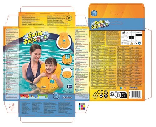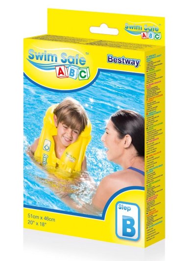 Táto nafukovacia záchranná vesta úrovne B je ideálna pre deti vo veku 3-6 rokov, ktoré pomaly získavajú sebadôveru, ale ešte nevie sama plávať. Má dve bezpečné, ľahko otvárateľné, nastaviteľné pracky a tri vzduchové komory pre väčšiu bezpečnosť a vztlak. Záchranná vesta Swim Safe ABC™ WonderSplash™ je dodávaná vo svetlej, pútavej žltej a ľahko sa nafukuje, vyfukuje a skladuje. Vyrobené z odolného PVC. Rozmer v nafúknutom stave: 45 x 33 x 16 cm. Rozmer vo vyfúknutom stave: 51 x 46 cm. Rozmery balenia: 21,5 x 14 x 4 cm. Maximálna nosnosť: 18-30 kg.