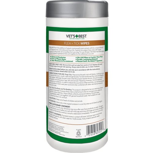 Utierky proti blchám a kliešťom Vet´s Best profitujú z pridania najsilnejších prírodných rastlinných extraktov s unikátnou zmesou mätového, citronelového a klinčekového oleja . Obsahujú iba prírodné a rastlinné zložky a esenciálne oleje. Tieto ultra mäkké vlhčené obrúsky čistia a deodorizujú srsť Vášho domáceho maznáčika a zároveň kontaktom zabíjajú blchy, blšie vajíčka a kliešte a odpudzujú komáre. Materiál utierky neobsahuje plastové živice ani parfumy. Pokiaľ sa utierky používajú podľa pokynov, sú bezpečné a jednoduché na použitie aj na citlivých častiach tela a je možné ich použiť aj na povrchy (napr. obojky).
