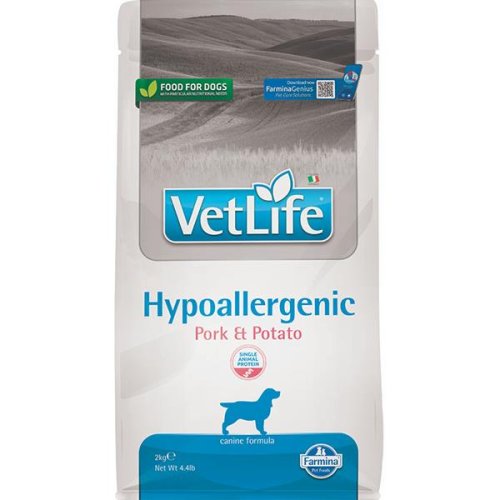 Farmina Vet Life Hypoallergenic Pork & Potato je kompletné suché dietetické krmivo pre psov určené na zníženie výskytu potravinových alergií a neznášanlivostí (intolerancií). Granule sa používajú aj na podporu správnych funkcií kože v prípade kožných porúch a nadmernej straty srsti. Jediným zdrojom proteínov v krmive je dehydrovaný bravčový proteín a jediným zdrojom sacharidov batáty, čím je eliminovaná neznášanlivosť voči iným zložkám potravy. Hlavné výhody: