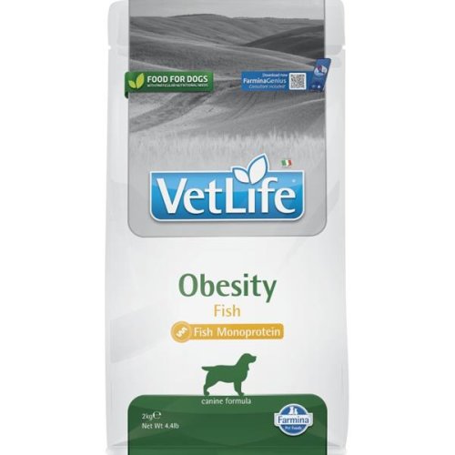 Farmina Vet Life Obesity Fish je kompletné suché dietetické krmivo pre dospelé psy vyvinuté špeciálne za účelom zníženia nadmernej telesnej hmotnosti. Granule sú vďaka nízkemu obsahu tukov a cukrov ideálne pre psy trpiace obezitou. Zdrojmi sacharidov v krmive sú špalda a ovos, pôvodné pestované obilniny s nízkym glykemickým indexom, ktoré umožňujú postupné uvoľňovanie energie počas dňa. Hlavné výhody: