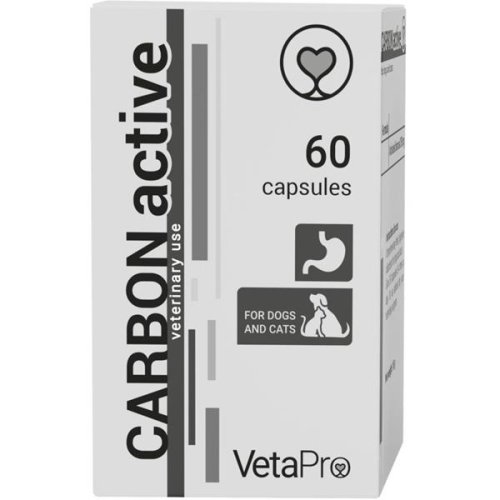 Carbon Active je doplnkové krmivo pre psy a mačky pôsobiace ako tráviaci adsorbent. Zachováva normálnu funkciu tráviaceho traktu a napomáha detoxikácii organizmu. Vďaka rozsiahlemu povrchu aktívnych častíc má aktívne uhlie schopnosť absorpcie veľkého počtu látok organického a neorganického pôvodu a plyny. Z gastrointestinálneho traktu sa nevstrebáva a nepodlieha metabolickému rozkladu, ale spolu s látkami, ktoré absorbuje, sa vylúči z organizmu stolicou. Zloženie: aktívne uhlie 250 mg Doplnkové látky: želatína Návod na použitie: psy a mačky: 2–3 kapsule do 20 kg hmotnosti 3–4× denne, alebo podľa odporúčania veterinárneho lekára. Kapsulu je možné podať celú priamo na koreň jazyka zvieraťa alebo ju otvoriť a jej obsah primiešať do krmiva. Skladovanie: Skladujte na chladnom a suchom mieste, mimo dosahu priameho slnečného žiarenia. Uchovávajte mimo dosahu detí. Upozornenie: Určené iba pre zvieratá!