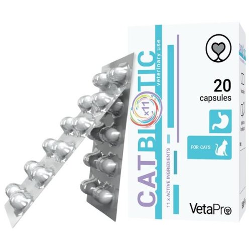 Cat Biotic je doplnkové krmivo pre mačky, ktoré zachováva normálne funkcie črevnej mikroflóry. Synbiotický doplnok probiotík a prebiotík podporuje správnu mikrobiálnu rovnováhu v črevách a celkové zdravie tráviaceho traktu. Zloženie: frukto-oligosacharidy (FOS), mannán-oligosacharidy (MOS), kyselina maslová, dextróza, pektín, hydrolyzovaný živočíšny proteín (morčacie a kuracie mäso), stearan horečnatý, želatínové (hovädzie) tvrdé kapsule. Zootechnické doplnkové látky: (4b1705) Enterococcus faecium NCIMB 10415, Bacillus subtilis (4b1823). Technologické doplnkové látky: (E559) kaolín, (551c) kremelina (čistená rozsivková zemina), (E 551b) koloidný oxid kremičitý. Návod na použitie: 1–2 kapsule denne, alebo podľa odporúčania veterinára. Skladovanie: Skladujte na chladnom a suchom mieste, mimo priameho slnečného žiarenia. Uchovávajte mimo dosahu detí. Upozornenie: Určené iba pre zvieratá!
