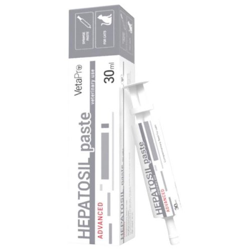 Hepatosil Advance paste je doplnkové krmivo pre mačky, ktoré pomáha podporovať funkciu pečene v prípade zlyhania alebo dysfunkcie. Regeneruje a chráni hepatocyty, urýchľuje regeneráciu pečene a obnovu ich normálnej funkcie. Zloženie: dextróza, voda, oligofruktózový sirup, glycerol, sójový olej*, melasa z cukrovej repy, hovädzia želatína, spracovaná živočíšna bielkovina (kuracie a morčacie), aróma. Nutričné doplnkové látky: vitamíny: (3a700) vitamín E. Senzorické doplnkové látky: (2b Silybum marianum) extrakt z pestreca mariánskeho, (2b) suchý extrakt z artičoka. Aminokyseliny: (3c362) ornitín. Emulgačné a stabilizačné činidlá: polyoxyetylén (20), sorbitan monooleát (E 433). *NON-GMO – sójový olej vyrobený z geneticky nemodifikovaných organizmov Dávkovanie: 1 ml na 5 kg telesnej hmotnosti denne, alebo podľa odporúčania veterinára. Skladovanie: Skladujte na chladnom a suchom mieste, mimo dosahu priameho slnečného žiarenia. Uchovávajte mimo dosahu detí. Upozornenie: Určené iba pre zvieratá!
