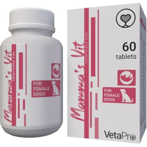 Mamma´s Vit je nutričný doplnok pre sučky počas gravidity a dojčenia šteniat. Pomáha čerstvým matkám dojčiť mláďatá vysoko kvalitným mliekom. Táto zmes vitamínov a minerálov je tiež skvelým doplnkom stravy pre sučky, ktoré môžu byť gravidné alebo sú vo veku rozmnožovania. Zloženie: dextróza (13.2.2), fosforečnan vápenatý (11.3.2), chlorid draselný (11.5.1), oxid horečnatý (11.2.1), škrob (kukuričný škrob 13.3.1), sušená jahňacia pečeň (9). (13.6.4). Nutričné doplnkové látky: vitamíny (na 1 tabletu): cholínchlorid (3a890} 160 mg, vitamín K 3 (3a711) 35 mg, niacín (3a314} 10 mg, kyselina pantotenová (3a841) 3,5 mg, vitamín B 1 thia vitamín B 2 (riboflavín 3a825} 1 mg, vitamín B 6 (pyridoxín hydrochlorid 3a831} 0,9 mg, kyselina listová (3a316) 200 µg, biotín (3a880} 22,5 µg), vitamín D 3 ( 3a6 (kyanokobalamín 3a) 3 µg. Stopové látky (na 1 tabletku): oxid zinočnatý (3b603) 7,5 mg, monohydrát síranu železnatého (II) (3b103) 3 mg, monohydrát síranu manganatého (3b503) 1,5 mg 75 µg, obalený granulovaný seleničitan sodný (3b802) 42,5 µg Technologické doplnkové látky: (E460) MCC, (E464) hydroxypropylmetylcelulóza, (E 551b) koloidný oxid kremičitý. veterinárneho lekára.Najlepší účinok má dvojito obalená tableta priložená ku koreňu zvieratá a prehltnutá v celku.