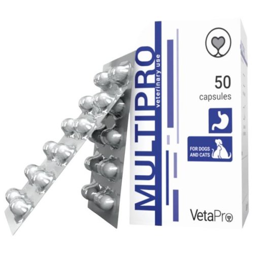 Multipro je nutričný doplnok pre psov a mačky s narušenou črevnou rovnováhou trpiacou akútnou hnačkou, po dehelmintizácii (odčervení) alebo u šteniat a mačiatok s riedkymi výkalmi. Zachováva normálnu funkciu tráviaceho traktu. Enterococcus faecium nahrádza „zlé“ baktérie „dobrými“, ktoré prirodzene urýchľujú zvyšovanie počtu baktérií pôsobiacich protizápalovo v gastrointestinálnom trakte. Pôsobí ako inhibítor na rôzne patogény. Zastavuje infekčné hnačky a hnačky vyvolané antibiotikami a účinkuje proti nim aj preventívne. Zlepšuje rovnováhu mikroflóry u všetkých psov a mačiek, ktorí sú v strese. Podporuje rast ďalších zdraviu prospešných baktérií v gastrointestinálnom trakte. Bacillus subtilis posilňuje imunitný systém psov a mačiek a pomáha organizmu v boji proti škodlivým baktériám a vírusom a spolupôsobí s Enterococcus faecium. Zloženie: Probiotiká: Enterococcus faecium NCIMB 10415 2 × 10 9 CFU/g, Bacillus subtilis 2 × 10 9 CFU/g, Prebiotiká: frukto-oligosacharidy (FOS) 150 mg/ga mannán-oligosacharidy (MOS) 15 Dávkovanie 1 kapsula denne, alebo podľa odporúčania veterinárneho lekára. Kapsule je možné podať psovi alebo mačke priamo do papule na koreň jazyka, alebo kapsulu otvoriť a jej obsah primiešať do krmiva. Skladovanie: Skladujte na chladnom a suchom mieste, mimo dosahu priameho slnečného žiarenia. Uchovávajte mimo dosahu detí. Upozornenie: Určené iba pre zvieratá!