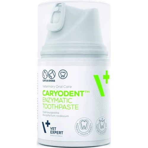 Enzymatická zubná pasta Caryodent pre psov a mačky bola vytvorená v spolupráci s veterinármi s cieľom poskytnúť najvyššiu úroveň ústnej hygieny. Receptúra založená na troch prírodných enzýmoch účinne rozpúšťa bakteriálny povlak a zvyšky jedla, čím zabraňuje tvorbe zubného kameňa. Zubná pasta obohatená o hydroxyapatit ponúka množstvo výhod: podporuje remineralizáciu skloviny, obnovuje integritu zubov a pomáha znižovať citlivosť. Znižuje tiež tvorbu povlaku a po použití sú zuby vizuálne belšie a žiarivejšie. Prítomnosť prebiotík navyše podporuje zdravý ústny mikróbiom, ktorý je zásadný pre dlhodobú ochranu. Zloženie je obohatené o výťažky z β-karyofylénu, šalvie a mäty, ktoré pomáhajú pri hojení a regenerácii ďasien a starajú sa o komplexnú starostlivosť o ústnu dutinu vášho maznáčika. Hlavné prednosti: