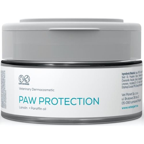 Paw Protection ošetrujúca a ochranná masť pre psov a mačky je prípravok určený na starostlivosť o chúlostivé labky zvieraťa. Chráni počas prechádzok v ťažkých poveternostných podmienkach (ako je mráz alebo teplo) a okolitých podmienkach (napr. prítomnosť štrku alebo soli v zemi). Vďaka oleju z čajovníka má masť horkú chuť, ktorá odrádza od lízania a umožňuje ju použiť na odstránenie obvyklého lízania alebo hryzenia srsti.