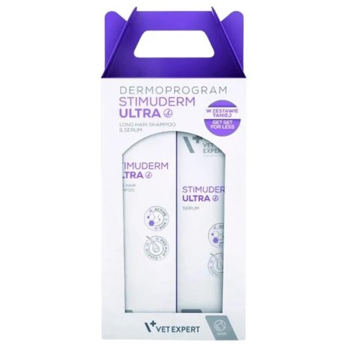 Stimuderm Ultra Dermoprogram Duobox Long Hair je dvojstupňová starostlivosť pre dlhosrsté psy, ktorá sa skladá zo šampónu a séra. Balenie obsahuje dva produkty - Stimuderm Ultra Long Hair Shampoo a Stimuderm Ultra Serum -, ktoré tvoria ucelenú sadu pre starostlivosť o kožu a srsť psov s nadmerným vypadávaním srsti z rôznych príčin a/alebo s oslabenou srsťou (napr. v období pĺznutia). Preparáty Stimuderm Ultra sú založené na patentovanej molekule ACTIVE NTM ® . Ide o molekulu vitamínového pôvodu stimulujúcu opätovný rast srsti. Účinnosť bola overená štúdiami. AKTÍVNE NTM: