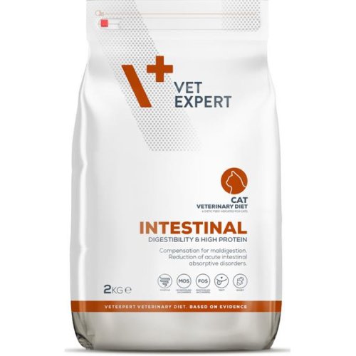 VetExpert VD 4T Intestinal Cat suché je kompletné diétne krmivo pre dospelé mačky, ktoré trpia poruchami trávenia, akútnymi črevnými problémami alebo chronickou pankreatickou nedostatočnosťou. Obsahuje vysoko stráviteľné zložky, prebiotiká, zvýšený obsah elektrolytov a antioxidant luteín na celkové upokojenie tráviaceho traktu. Hlavné benefity: