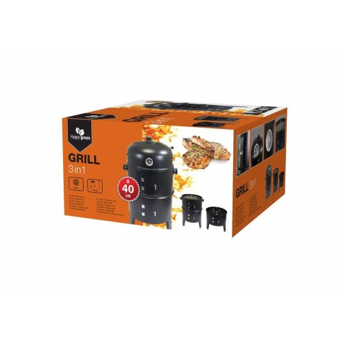 Multifunkčný gril 3v1 s priemerom roštu 40 cm ocenia milovníci dobrého jedla. Gril 3v1 umožňuje údiť, grilovať aj opekať. Pokrm je tepelne pripravovaný nad nádobou s vodným kúpeľom pomocou tepla a dymu. Tým nedochádza k vzniku zdraviu škodlivých látok, ktoré by sa inak dostávali do pokrmov. Gril sa skladá z troch častí: ohnisko, vyšší gril, uzavr. udiareň. Dve časti majú dvierka na prikladanie a kontrolu ohňa, vrchnú časť teplomer do 300 st.C , 2 tyče na zavesenie údených pokrmov a otvor na vypúšťanie dymu.