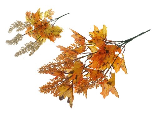 Dekoračná vetvička s dĺžkou 400 mm s jesenným motívom v kombinácii oranžovej a bielej farby. Farebné prevedenie je dodávané v mixe, jednotlivé kusy sa môžu líšiť vzhľadom aj odtieňom.
