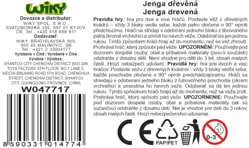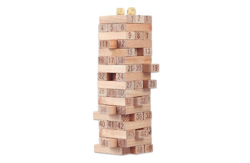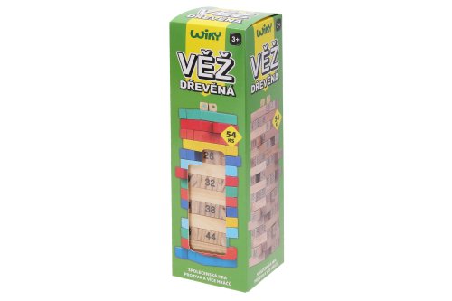 Veža drevená s číslami. 54 dielikov. Rozmery poskladané veže 6,3x6,3x20 cm, jedného dielika 6,3x2,1x1,1 cm. Český obal.