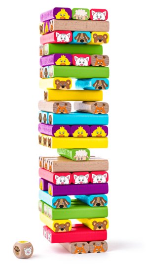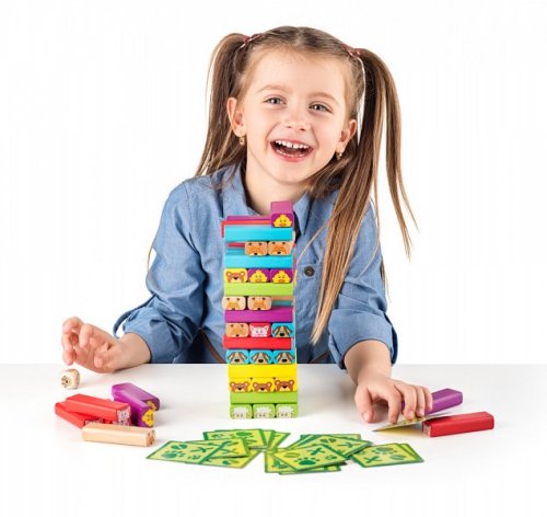 Ako veľmi si šikovný? Napínavá hra pre celú rodinu. Klasická stolová hra, ktorá ponúka mnoho zábavy a vtipných okamihov. Na stole sa postaví veža zo všetkých kameňov. Hráči sa striedajú v poradí a postupne sa snažia opatrne jeden kameň z veže vytiahnuť bez toho, aby veža spadla. Prehráva ten hráč, ktorému veža spadne! Hráči hádžu kockou. Každé kolo postupne vyťahujú z veže hracie kamene s tým zvieratkom, ktoré im padne na hracej kocke. Kameň, ktorý vytiahnu, položí navrch veže tak, aby veža nespadla. Obtiažnejším variantom je verzia, kedy hráči vyťahujú z veže hracie kamene podľa obrázkov na kartách. Tie vyťahujú z kôpky, ktorú umiestnia uprostred stola. Na kartách objavia nielen obrázky daných zvierat, ale aj ich siluety alebo obrázok potravy, ktorú dané zviera jedia. Musí potom premýšľať nad tým, ktorý potom kameň to majú vlastne vytiahnuť. Obsahuje: 52 dielikov. Rozmer veže: cca 23 x 7,5 cm. Vhodné pre deti od 4 rokov.
