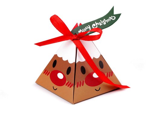Vianočná krabička pyramída zaujme deti aj dospelých. Hore sa ozdobne zaväzuje pomocou priloženej stužky. Súčasťou balenia je aj priväzovacia vlajočka Merry Christmas. Krabičku môžete použiť na drobné darčeky alebo ju naplniť dobrotami na Mikuláša. Dodávame ju v rozloženom stave (17,5 x 17,5 cm). Zložíte ju jednoducho podľa vyznačených ohýbacích krajov. Krabička nemá atest na potraviny, pochúťky a iné maškrty odporúčame vložiť zabalené v sáčku.