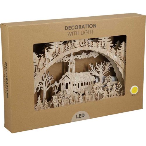 Čarovná vianočná dekorácia z prírodnej preglejky navodí príjemnú sviatočnú atmosféru v každom interiéri. Vďaka LED osvetleniu krásne žiari a ponúka dve varianty vianočných scén, ktoré zútulnia váš domov.
