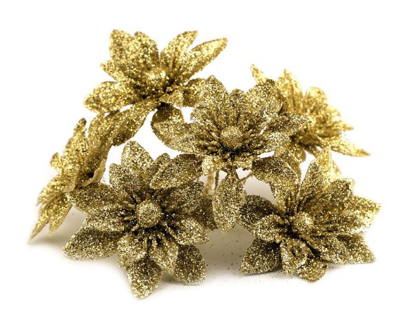 Rozkvitnuté vianočné hviezdy nesmú chýbať v žiadnom vianočnom aranžmáne. Ich povrch s trblietavými glitrami dodá vášmu domovu nádych elegancie a luxusu. Kvety vianočnej hviezdy sú pripevnené k ohybnému drôtiku, ktorým je možné ľahko manipulovať. V jednom zväzku je 6 kvetov vianočných hviezd. Použitie: Jednotlivé kvety môžete ľahko naaranžovať na vence, kvetinové väzby či sviatočnú tabuľu. Sú vhodné aj na zapichovanie do polystyrénových polotovarov.