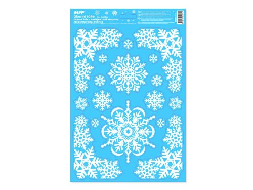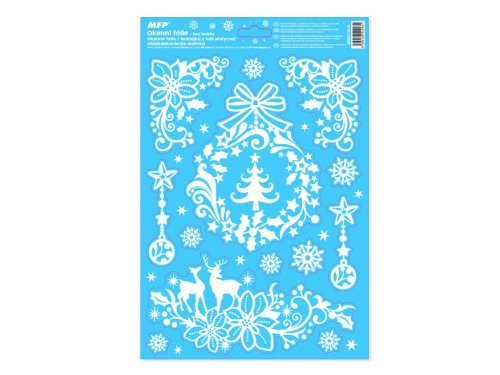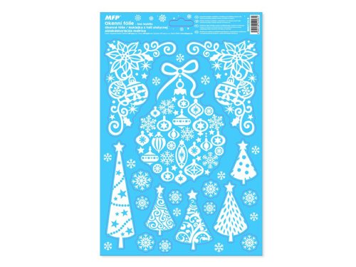 Vianočné okenné fólie bez lepidla s vianočnými motívmi (vločky, stromčeky, hviezdy).