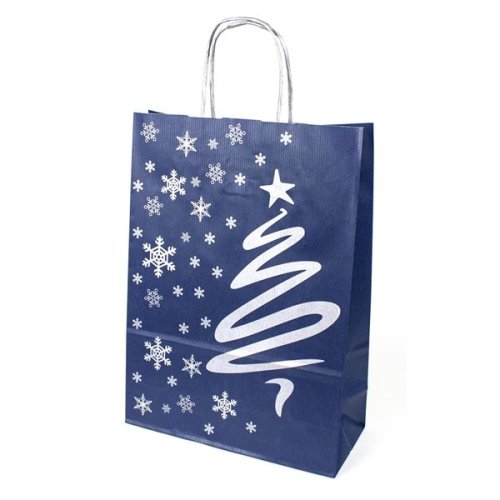 Modrá darčeková taška s motívom bieleho stromčeka a hviezd