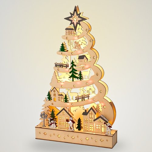 Dekoratívny vianočný stromček v prírodnej farbe s jemnými zelenými doplnkami, osadený 15 teplými bielymi LED diódami, ideálny na vytvorenie sviatočnej atmosféry v menších priestoroch či na stole.