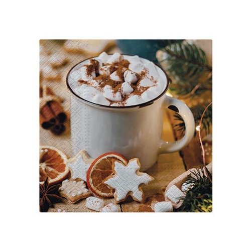 Papierový vianočný obrúsok s motívom zimného horúceho nápoja, sušených pomarančov a perníčkov je vyrobený z veľmi kvalitného trojvrstvového papiera Tento obrúsok je ideálny pre využitie pri vianočnom stolovaní.