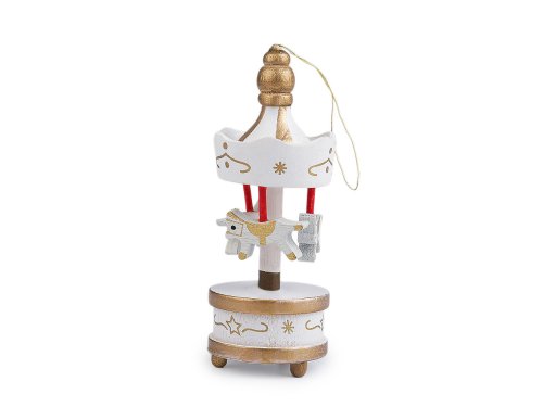 Drevený miniatúrny kolotoč ozdobí vianočný stromček, vetvičky vo váze aj dekoračné vence. Pôsobí roztomilo a má pútavo spracované detaily. Evokuje spomienky na dávne časy a vnáša do domova kúzlo tradícií.