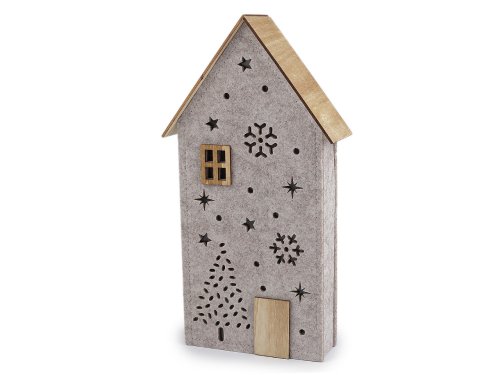 Svietiaci dekoračný domček má základ z pevného filcu a strechu a detaily z dreva. Z prednej strany má výrezy v podobe vločiek, hviezdičiek a stromčeka. Svieti príjemným teplým svetlom. Zútulnia každý interiér. Batérie (2x CR2032) sú súčasťou balenia.