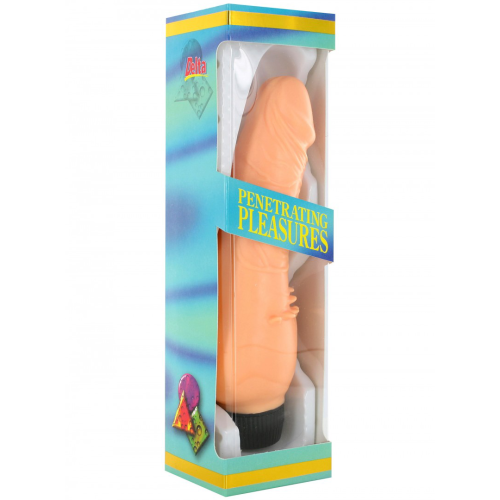 Vibrátor telovej farby, ktorý je mierne zahnutý a má na spodnej strane malé výstupky.