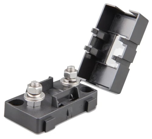 Držiak určený pre poistky Victron MIDI. Má odnímateľnú krytku a poistky sa pripevňujú na dvojicu skrutiek M5.
