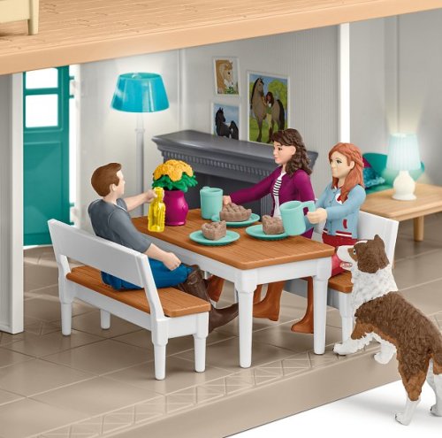 Vidiecky dom a stajňa pri jazere HORSE CLUB rodiny Kramerovcov je skutočným rajom pre milovníkov koní. Každé ráno arabská kobyla a jej žriebä netrpezlivo čakajú, až je Hannah osedlá a vyjde s nimi na prechádzku. Border kólia Ruby sa tiež rada pridá. Po vychádzke ich Hannah v stajni dôkladne umyje a vykefuje. Vo vzduchu sa vznáša vôňa jablčného koláča. Pani Kramerová musí piecť. Na balkóne spoločne kúsok ochutnajú. Hannah nechodí večer hneď spať. Radšej si vylezie na povalu. Tam sleduje ďalekohľadom hviezdnu oblohu. Dokáže zahliadnuť svoju budúcnosť vpísanú vo hviezdach? Vidiecky dom a stajňa pri jazere HORSE CLUB má všetko, čo kone a ich priatelia môžu potrebovať. Uzda a sedlo na jazdu sú uložené v stajni. Potom na teba čaká hadica na vodu, vedro a kefa na starostlivosť o žriebä a arabskú kobylu. Dom rodiny Kramerovcov je pohodlne zariadený a má dokonca balkón. Dokonca aj rodinný pes Ruby sa tu cítia ako doma. Figúrky sú plne pohyblivé. Tento výrobok Schleich® patrí do tematického sveta HORSE CLUB a je vhodný pre deti vo veku od 5 do 12 rokov. Obsahuje: 1× dom, 1× stajňu, 1× balkón, 1× figúrka pána Kramera, 1× figúrka pani Kramerovej, 1× figúrka Hannah, 1× arabská kobyla, 1× arabské žriebä, 1× pes Ruby, 1× klobúk, 1× nádlo, 6× náramok, 6× látka, 1× uzda s oťažami, 1× upínacia tyč, 1× držiak na hadicu s hadicou na vodu, 2× vlajka, 1× fontána, 3× rozeta pre víťazov, 1× box na hrebelcovanie, 1× hreblo, 1× kefa na hrebelcovanie, 1× červená sena, 1× balík slamy, 1× zelené jablko, 1× vedierko, 2× žľab na kŕmenie, 2× napájačka, 1× seno, 1× veľký žľab na kŕmenie, 1× helma, 1× zväzok mrkvy, 1× vidly, 1× dvojlôžko s 1 lôžkom, dvojlôžko, 2× jednolôžko s matracom, 2× vankúš na jednolôžko, 2× perina na jednolôžko, 1× nočný stolík, 1× nočná lampička, 1× toaleta, 1× umývadlo, 1× sprcha, 1× skrinka s drezom a rúrou, 1× jedálenský stôl, 1× lavica, 1× drevená debna, 4× kus jablčného koláča, 1× kľúč, 4× tanier, 4× hrnček, 1× panvica, 1× hrniec na varenie, 2× fľaša, 1× sporák, 1× pohovka, 1× stôl váza s kvetinami, 1×schodisko, 1× vchodové svetlo, 1× veterná korouhev s koňom, 1× hromada dreva, 1× ďalekohľad, 1× rebrík, 1× stolík na balkóne, 2× stolička na balkóne, 1× slnečník, 1× kufor, 3× . Rozmery produktu: 42 x 24 x 96 cm. Rozmery balenia: 42,5 x 64,5 x 16 cm.