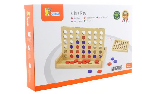 Drevené piškvorky. Cieľom je zoradiť vedľa seba 4 dieliky rovnakej farby. Rozmery hry 29,3 x19x18,5. Rzmery balenia 30x19x5 cm.