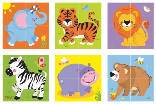 Drevené obrázkové kocky (kubusy) s obrázkami zvieratiek zo zoo. Prostredníctvom štyroch drevených kociek deti poskladajú šesť rôznych obrázkov. Pri skladaní precvičí predstavivosť aj jemnú motoriku. Určené pre deti od 24 mesiacov.