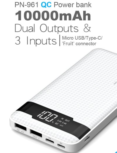 Technické špecifikácie: Značka: Viking Model: PN-961PD 10000mAh Kapacita: 3.7 / 10000mAh / 37Wh Batéria: Li-pol Rozmer: 145.5 72.8 14.3mm Hmotnosť: 220g Výstupný USB-A (QC3.0): 3 12V/1.5A (18 W max) Výstupný USB-C (PD3.0): 5 V/3 A, 9 V/2 A, 12 V/1.5 A (18 W max) Vstupné Apple Lightning: 5V/2A Min. počet nabití: 500x Nabíjacia doba: s podporou QC/PD cca 2hod. Príslušenstvo: micro USB nabíjací kábel Certifikácia: CE, FC, Rohs