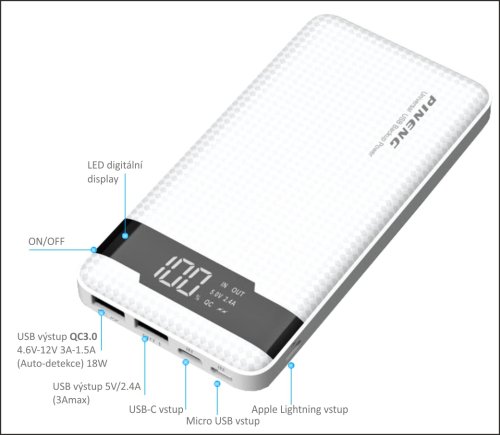 Kľúčové vlastnosti: • Kapacita batérie 10000 mAh (37Wh) • Podpora rýchleho nabíjania (USB-C Power Delivery a Qualcomm Quick Charge 3.0) • 2x USB-A a 1x USB-C výstup • USB-C, Apple Lightning aj Micro USB vstup pre flexibilné možnosti dobíjania powerbanky • proti prepätiu, prehriatiu a prebitiu • LED display ukazuje stav nabitia batérie • Elegantné a odolné prevedenie vďaka tenkému kovovému telu • Kompaktné rozmery a nízka hmotnosť – ideálne na cesty aj každodenné použitie • Vhodná na nabíjanie mobilných telefónov, slúchadiel, chytrých hodiniek a ďalších zariadení