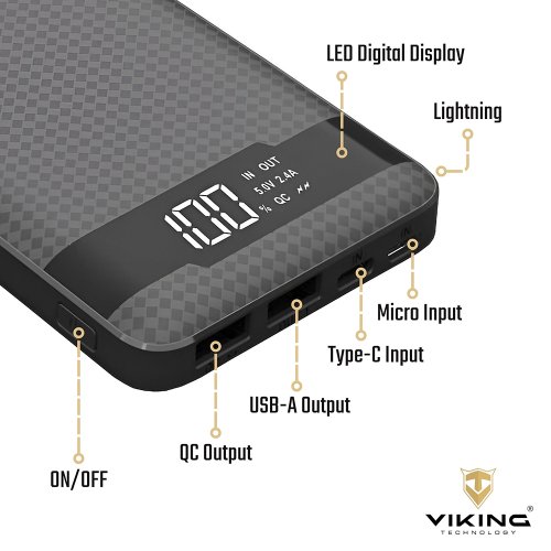Powerbanka Viking PN-961PD 10000mAh • Kapacita: 10000mAh/37Wh • Maximálny výkon: 18W • Rýchle nabíjanie PD 3.0 a QC 3.0 • Široká škála vstupov a výstupov (USB-A, USB-C, Micro USB, Apple Light