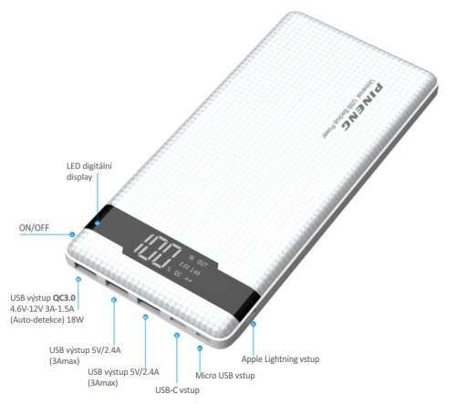 3x vstupné konektory Vám zaistia nabíjanie powerbanky akýmkoľvek káblom, ktorý máte pri sebe. Powerbanka podporuje vlastné nabíjanie cez USB-C, Apple Lightning a micro USB. Konektor micro USB a USB-C podporuje rýchlonabíjanie powerbanky (18W max).