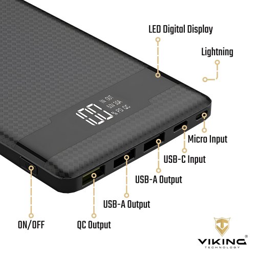Powerbanka Viking PN-962PD 20000 mAh • Kapacita: 20000mAh/74Wh • Maximálny výkon: 22,5W • Rýchle nabíjanie PD 3.0 a QC 4.0+ • Široká škála vstupov a výstupov (USB-A, USB-C, Micro USB LED display