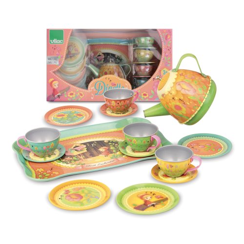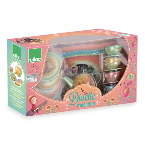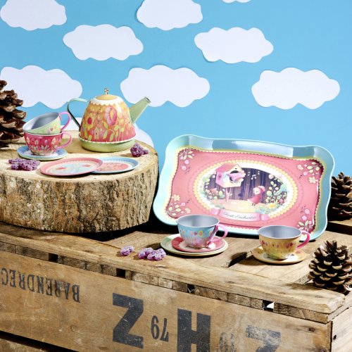 Kovový set riadu s krásnou rozprávkovou ilustráciou „magického lesu“, s podtáckom. Tento set je špeciálny v tom, že pri servírovaní hrá hudbu. V balení nájdete 14 ks vybavenia: veľká tácka pre ľahký presun riadu, 4 hrnčeky s podtácky, 4 dezertné tanieriky a kanvičku, ktorá pri náklone začne hrať peknú melódiu. Veľkosť tak akurát pre detské ruky. Vyrobené vo Francúzsku. Hlavné vlastnosti: obsahuje 14 kskovový riadkanvice v sebe ukrýva naťahovací hrací strojčekvyrobené vo Francúzsku