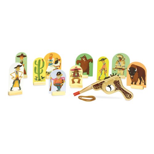 Divoký západ! Westernová hra, v ktorej vyhráva ten, kto zostrelí najviac cieľov. Jednoducho natiahnite gumičku na drevenú pištoľku, postavte terče a môžete začať strieľať. Hlavné vlastnosti: trénuje presnosť