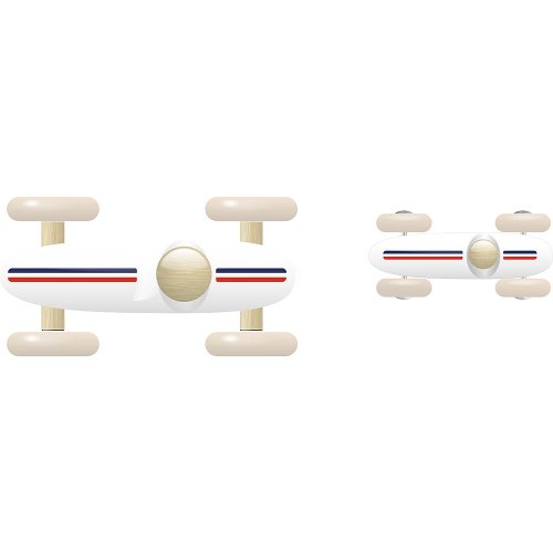 Model bieleho vintage auta zo závodu Grand Prix. Vyrobené z lakovaného dreva vo Francúzsku. Má veľké biele gumové kolesá, ktoré zaisťujú tichý chod na všetkých podlahách. Hlavné vlastnosti: vyrobené vo Francúzsku