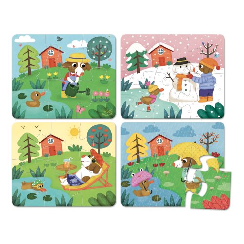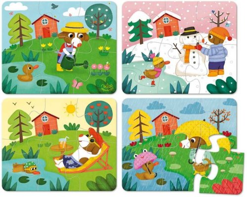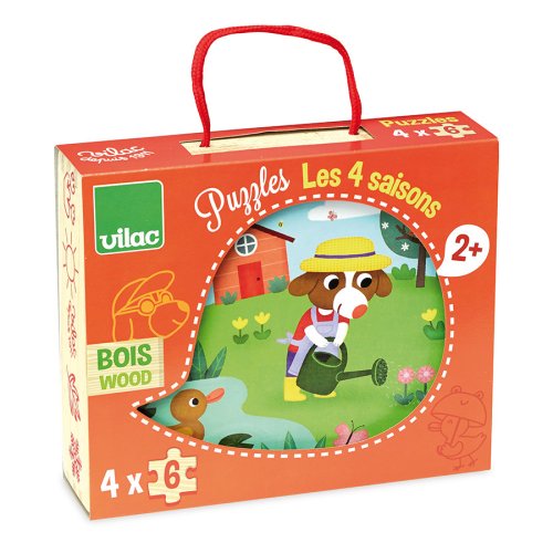 Štvory drevené puzzle so šiestimi dielikmi s tematikou štyroch ročných období. Zabalené v peknom drevenom boxe s bavlnenou rukoväťou. Hlavné vlastnosti: 4 puzzle po 6 dielikoch praktický úložný box