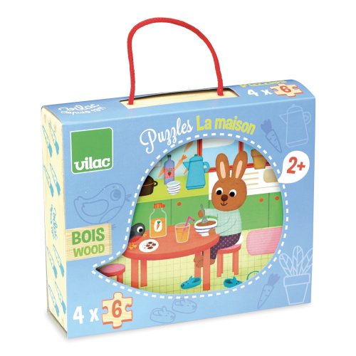 Drevené puzzle so šiestimi dielikmi s tematikou domácnosti. Štyri rôzne obrázky. Zabalené v peknom drevenom boxe s bavlnenou rukoväťou. Hlavné vlastnosti: 4 puzzle po 6 dielikochpraktický úložný box