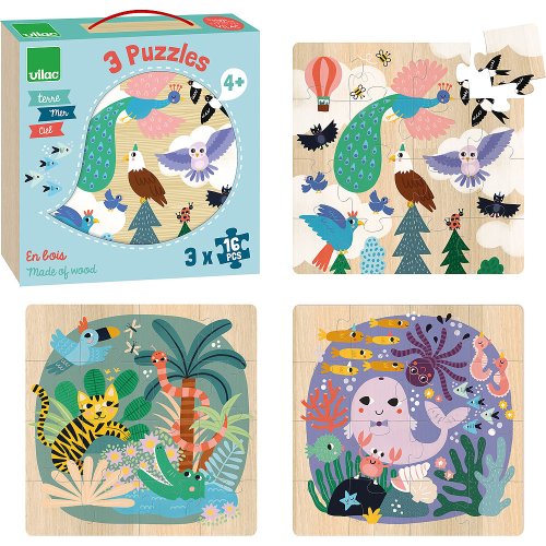 Sada 3 obrázkových puzzlí v praktickej krabičke. Ilustrácie Michelle Carlslund predstavujú tri scény rôznych prírodných prostredí na súši, v mori a na oblohe. Scéna v oblakoch s veľmi krásnym pávom, orlom, sovou a ďalšími rôznymi vtákmi . Ďalšia scéna vo vlnách s veľkou veľrybou, chobotnicou, morskými koňmi a ich priateľmi rybič kami. Konečne posledný v džungli s tigrom, ktorý sa baví s krokodílom, hadom a papagájom. Puzzle podporí učenie obratnosti a pozorovania. Hlavné vlastnosti: obsahuje 3x16 dielikov design Michelle Carlslund Cestujte s nami v naivnom a elegantnom svete dánskej ilustrátorky Michelle Carlslund, svete jemných farieb, ktorý je plný roztomilých medveďov a priateľských vtáčikov. V roku 2010, keď Michelle ešte študovala grafický dizajn, vytlačila doma svoje ilustrácie a skúsila ich predať na dizajnovom trhu, kde sa stretli s veľkým úspechom! Niekoľko obchodíkov chcelo začať predávať jej výtvory, a tak jej napadlo, že by bolo fajn začať podnikať. Michelle sa rýchlo stala uznávanou nezávislou ilustrátorkou. Dnes je možné jej ekologické grafické diela zakúpiť po celom svete v dizajnových butikoch, papiernictvach a detských obchodoch. Michelle sa inšpiruje všetkým okolo nej. Jej výtvory sú nežné a poetické, štylizovaný a detinský štýl, ktorý sa perfektne prelína s hračkami firmy Vilac. „Som hranolky milujúca, časová optimistka a tvorkyňa ekologických plagátov a ilustrátorka na voľnej nohe so sídlom v dánskej Kodani,“ to by povedala ilustrátorka Michelle Carlslundová, keby sa mala popísať jednou vetou.