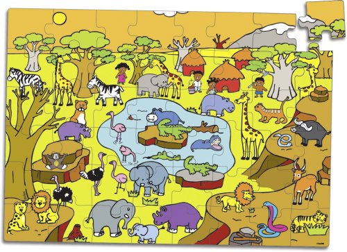 Detské puzzle s 48 dielikmi v motívoch savany, v peknej drevenej krabici. Drevené puzzle má pekné a sýte farby. Hlavné vlastnosti: podlahové puzzle s veľkými drevenými dielikmi obsahuje 48 dielikov rozvíja logické myslenie detí