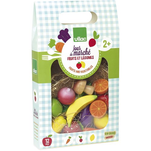 Sada ovocia a zeleniny, s ktorou sa deti môžu hrať na malých obchodníkov na trhu. Pekná lepenková krabica obsahuje mrkvu, citrón, reďkovku, pór, baklažán, šampiňón, paradajku, banán, jablko, hrušku, jahodu a dve polovice pomaranča. Ovocie je drevené s plstenými doplnkami . Hlavné vlastnosti: vhodné do každej kuchynky potraviny vyrobené z dreva obsahuje 12 ks