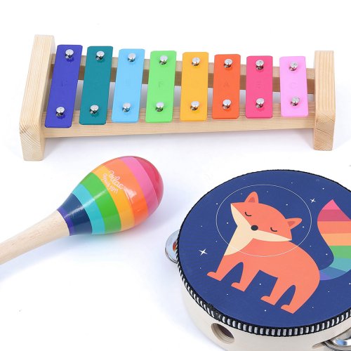 Nech hudba znie! Súprava pestrofarebných perkusných nástrojov zdobených motívmi výtvarníka Andyho Westface. Skladá sa z xylofónu, tamburíny, trianglu a maracas. Prostredníctvom nich môžu deti budovať svoj vzťah k hudbe, cit pre rytmus aj melódiu. Hrou s nástrojmi je možné rozvíjať jemnú motoriku, prehlbovať fantáziu a kreatívne zručnosti. Vďaka kombinácii kovu a dreva sú pevné, odolné a môžu ponúknuť dlhú životnosť. Hlavné vlastnosti: xylofón s paličkou, triangel, tamburína a maracasdesign Andy Westfacepevné a odolné prevedenie Andy Westface je ilustrátor žijúci a pôsobiaci v Hongkongu. Svojou prácou sa snažia sprostredkovať silné pocity a jasné myšlienky za pomoci jednoduchých tvarov, kompozícií i farebnosti. Typickými prvkami jeho diel sú zvieratá a dúha, ktoré si obľúbil pre ich čistotu, úprimnosť a schopnosť vzbudzovať radosť.