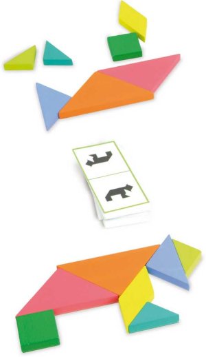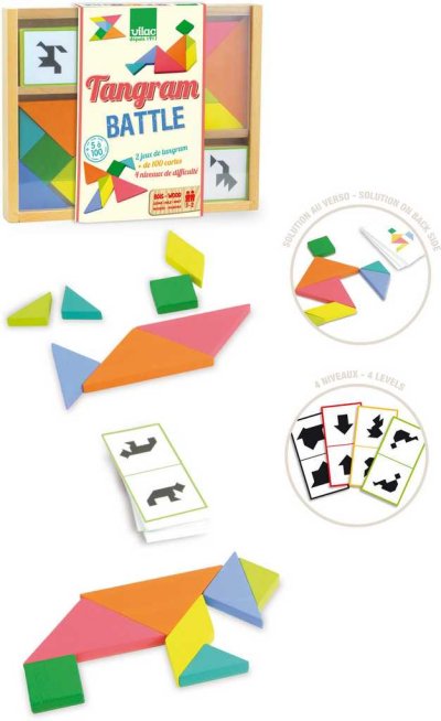 Ten, kto ako prvý postaví tangram podľa obrázku na kartičke vyhráva! Hra obsahuje viac ako 100 kartičiek a má 4 úrovne obtiažnosti. Balenie obsahuje dva sety tangramov a kartičky so siluetami. Hra je vhodná pre 1-2 hráčov od 5 do 100 rokov veku. Hlavné vlastnosti: trénuje logické myslenie podporuje priestorovú predstavivosť