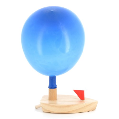Pri vypúšťaní vzduchu z balónika sa drevená loďka pohybuje vpred. Hlavné vlastnosti: pláva pomocou nafúknutého balónika